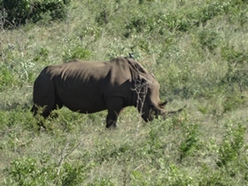 Weer een paar uur laten maakten we een stop bij een Wimpy's voor een lekkere kop koffie en rond half vier waren bij het Hluhluwe Park. We stapten weer met zijn tienen in een jeep en daar gingen we weer. Dit park was ook ontzettend mooi. Veel groener en bergachtiger. Daardoor waren er ook bijna geen impala's, want die hebben grasland nodig. We zagen deze keer wel ontzettend veel neushoorns. Ook een drietal lekker zonnend in een waterpoel. Ook een hele kudde olifanten met kleintjes van pas een half jaar. Hier kun je wel uren naar kijken. Verder een aantal Nyala's (een Antiopensoort), wrattenzwijnen met kleintjes en weer veel buffels. Wat een prachtige rit weer.