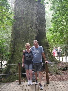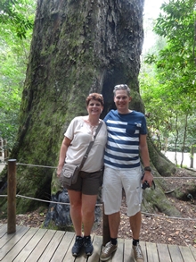 Na weer een uurtje gereden te hebben gingen we kijken bij de meer dan 1000 jaar oude Big Tree met zijn yellowood bladeren. Van deze oerbomen zijn er nog maar een paar over en deze was inderedaad enorm hoog met aan de bovenkant gigantische takken. Een stukje verderop lag nog een omgevallen boom, maar deze was intussen al helemaal overwoekerd en konden we niet meer zo goed zien. We liepen terug en zowel Anne en Erik als Paul en Natje kochten een paar mooie houten giraffen als souvenir.