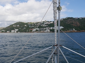 Tegen half vier kwamen we aan in het mooie plaatsje Knysna. Hier kregen we even wat vrije tijd bij het waterfront. Wel een beetje kort, dus gaan we hier waarschijnlijk nog een keerjte terug om lekker te gaan eten. Verderop lag een mooie catamaran voor ons klaar. Wij gingen met nog wat mensen uit onze groep lekker voor op de netten van de boot liggen. Hier lagen grote zitzakken op en we werden door de bemanning voorzien van een lekker wijntje en biertje. Binnen stond een hapjesbuffet voor ons klaar en terwijl we hier van genoten vaarden we door de mooie lagune van Knysna. Wat was dit genieten en wat hadden we een lol.