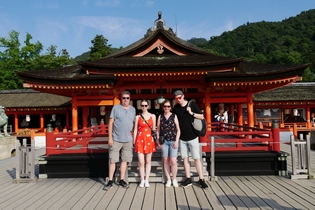 Onder de indruk liepen we nog een stukje door het vredespark. Daarna gingen we lunchen en namen we de tram naar de haven. Met de veerboot staken we over naar eiland Miyajima. Dit eiland staat vooral bekend om de mooie rode torii gate die met vloed in het water staat en waar je bij eb naar toe kunt lopen. We zagen hem vanaf de boot al liggen.