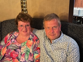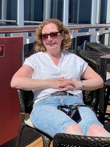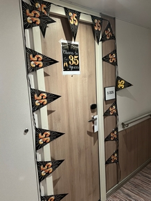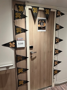 Vandaag een hele zeedag en dat merkten we vanmorgen meteen. De boot ging al wat heen en weer en dat zou in de loop van de dag nog heviger worden. Alsof je constant dronken bent. Miriam en Rudi zijn dit jaar 35 jaar getrouwd en Paul en Nat 30 jaar. Dat is niet niks, dus een mooie reden om hun cabindeur te versieren.