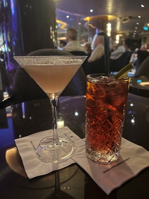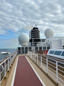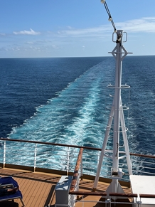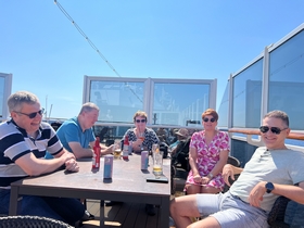 Intussen scheen het zonnetje lekker en we gingen weer heerlijk op het achterdek zitten. Tijd voor de eerste en zeker niet de laatste cocktail en biertje van vandaag. Miriam en Anne gingen tussendoor nog naar een mooie presentatie van de komende aanleghavens kijken. Om drie uur keek Erik op het grote scherm bij het zwembad de F1 terwijl de rest genoot van een lekkere high tea. Daarna nog wat drankjes en bitterballen op het achterdek terwijl we een dobbelspelletje deden.