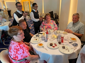 ‘s Avonds was het dressy night, dus trokken we iets moois aan voor het heerlijke galadiner. Daar werden Miriam en Rudi en Paul en Nat nog op een taartje getrakteerd terwijl de obers hen toezongen. In de BB Kings Club was het 70’s 80’s en Motown night met een erg goede band. Met een lekker drankje erbij een mooie afsluiting van een relaxte zeedag. Intussen is het half twaalf geweest en nog steeds licht buiten. De komende dagen in Noorwegen wordt het dan ook niet meer donker, heel apart om te zien. Morgenvroeg varen we de eerste fjorden binnen.
