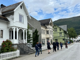 Zo konden we dit schattige stadje met oude witte houten huisjes inlopen. Bij de plaatselijke bakker aten we een typische Noorse Kanelboller, erg lekker. We keken even rond in het witte kerkje van Nordfjordeid, omgeven door oude graven en met binnen mooi gekleurd houtsnijwerk.