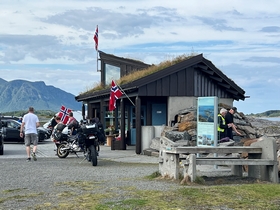 Daarna was het tijd voor het doel van vandaag, de Atlantic Road, of zoals ze hem hier noemen de Atlanterhavsveien. Een van de mooiste wegen van Europa zeggen ze. Dit is een weg met acht bruggen van eilandje naar eilandje. De bruggen maken af en toe zo’n rare kronkels dat het vanaf een bepaald punt lijkt of de auto’s er zo vanaf kunnen storten. Bij de tweede brug namen de we koffie met een stukje gebak bij een schattig kneuterig koffietentje en bij weer een andere brug konden we via een boardwalk een ronde lopen met ook weer mooi zicht op de bruggen.